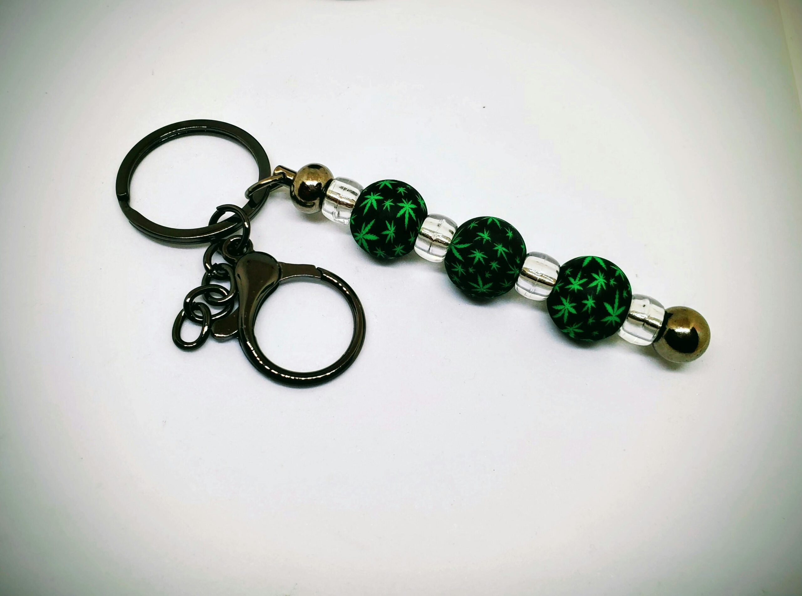 The 3″ Black Zinc Alloy Key Ring features a sleek, high‑definition bar that gives the piece a strong, modern presence. Soft black silicone beads wrap the design with a smooth, comfortable feel, each accented by subtle cannabis leaf patterns for a stylish, culture‑forward touch. Clear spacers break up the bead sequence, adding a crisp, minimalist contrast that keeps the layout visually balanced. A sturdy black hook offers reliable attachment to keys, bags, or accessories. Altogether, it’s a compact, durable key ring that blends clean design with a bold, cannabis‑inspired aesthetic.